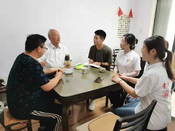 7月22日,在南艳湖居民区党群服务中心王书记的带领下,合肥学院教育学院“青春向党,‘育’你同行”团队的党员们来到89岁的抗美援朝老兵张振行家中。