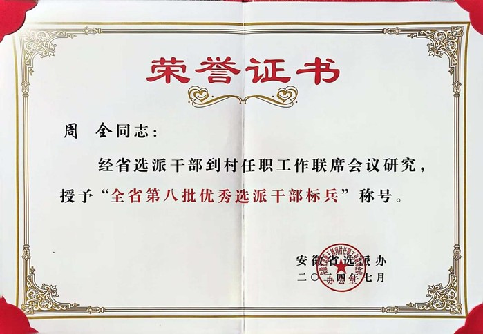 2021年6月,周全同志积极响应党的召唤,服从组织安排,到泗县山头镇惠庙村担任第一书记、工作队队长。他独创的“万键七发 助力惠庙振兴”工作法在全县驻村干部擂台比武中荣获第一名,并将“54871”乡村振兴“靶向法”在全省驻村干部中进行了经验交流。