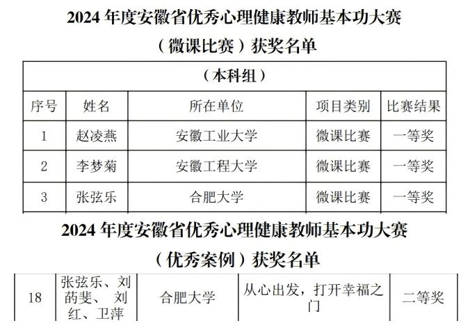 为贯彻党的二十大和二十届三中全会精神,落实教育部等十七部门联合印发《全面加强和改进新时代学生心理健康工作专项行动计划(2023—2025年)》和安徽省教育厅等十七部门联合印发《全面加强和改进新时代学生心理健康工作的若干举措》要求,进一步提高心理健康教育工作水平,促进心理健康教育教师专业发展,教育厅举办了优秀心理健康教师基本功大赛。我校组织专业教师积极备赛、参赛,其中教育学院张弦乐在微课教学比赛中荣获一等奖,教育学院张弦乐、刘菂斐、刘红、卫萍在优秀案例比赛中荣获二等奖。