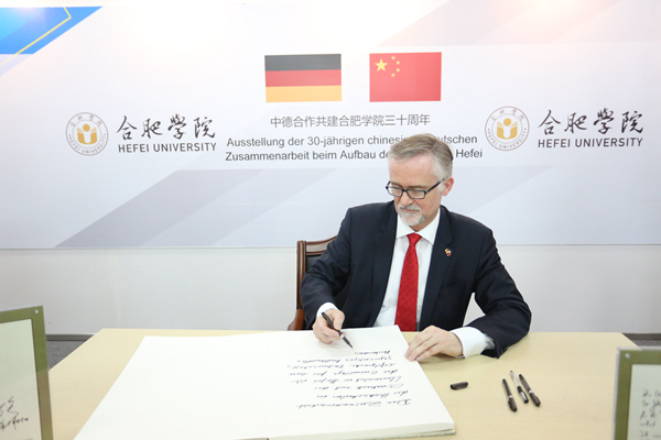 随后,蔡敬民陪同奥斯纳布吕克代表团一起参观了我校中德共建三十周年成果展,乌尔夫冈·格里赛尔特市长在留言台写下对我校的衷心祝福。