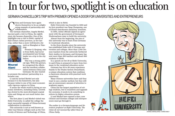 10月30日,国务院总理李克强与德国总理默克尔访问安徽省会合肥,参观了合肥学院并共同出席一系列重要活动。11月6日,在合肥学院任教的德国专家穆拉德·阿拉米(Mourad Alami)在中国日报社主办的《中国日报欧洲版》(China Daily European Weekly)上发表评论文章《中德总理访问合肥,教育合作成焦点》(In tour for two, spotlight is on education)。