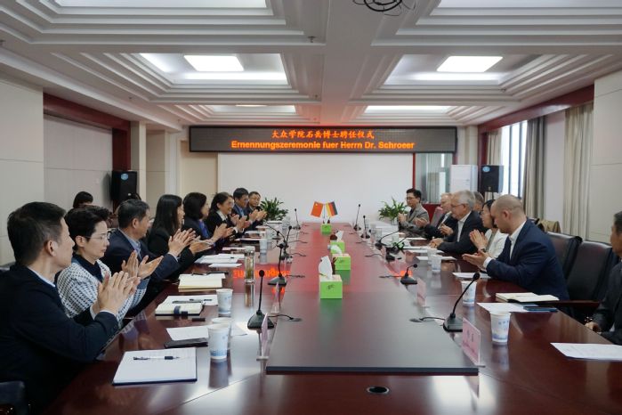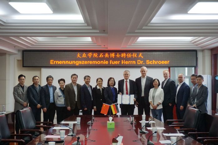 10月8日上午,学校举行特聘教授聘任仪式,全职聘请大众集团前高管、工程师石岳博士(Dr. Klaus Schröer)为大众学院特聘教授。院长吴春梅,组织部部长白义香,教务处处长、大众学院院长王晓峰,人事处处长纪平,国际交流合作处处长张慧,大众学院直属党支部书记宣跃文,先进制造工程学院院长胡学友及相关教师出席。大众安徽首席制造官施耐德博士(Harry Schneider),大众安徽效率管理总监朱江萍,大众安徽维修部总监亨德里克·迪普(Hendrik Dippe)受邀出席。仪式由副院长陈秀主持。