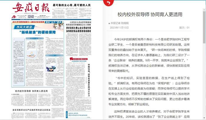 《安徽日报》头版报道合肥学院校企协同育人